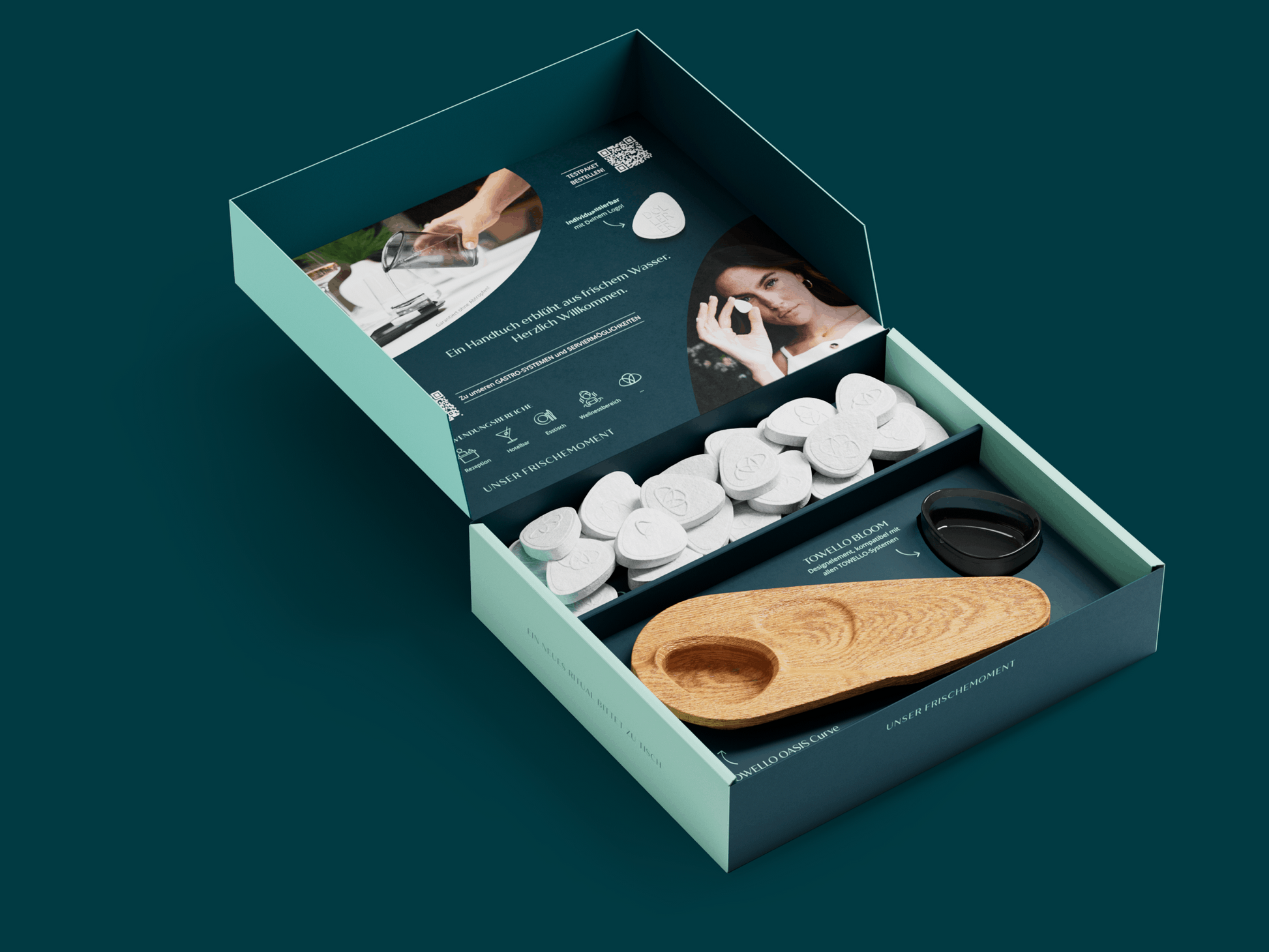 Our trial package invites you to discover a new culture of welcoming: the unique shape, the blooming effect in hot or ice-cold water, the extra-soft and generously sized towel, the subtle premium fragrance, and the unmistakable feeling of freshness.