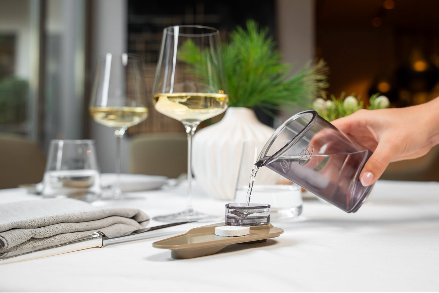 Sobald Deine Gäste Platz nehmen, gießt Dein Servicepersonal, je nach Jahreszeit, heißes oder kaltes Wasser aus der TOWELLO AQUA in die BLOOM ein und schafft so einen stillen Moment der Aufmerksamkeit.